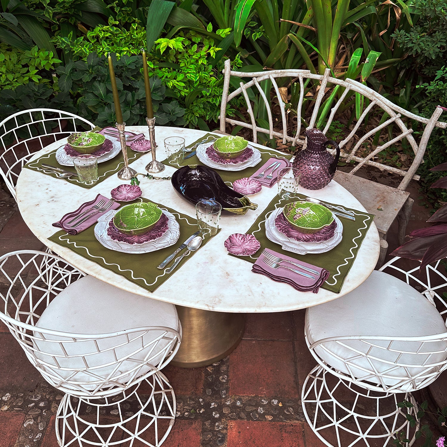 Hermoso set de 4 platitos para pan de cerámica pintada a mano estilo Mayólica, en forma de hojitas de repollo en color morado. Ideales para servir pan, postre o botana.