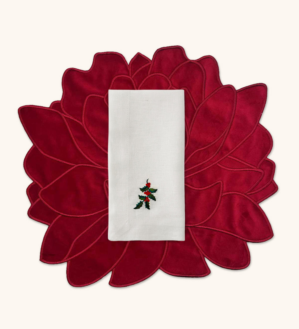 Set de Mantelería Nochebuena con Individuales Blossom Bordado de Flor en Terciopelo Rojo y Servilletas en Lino Blanco con Bordado de Muérdago. Set para 4 personas