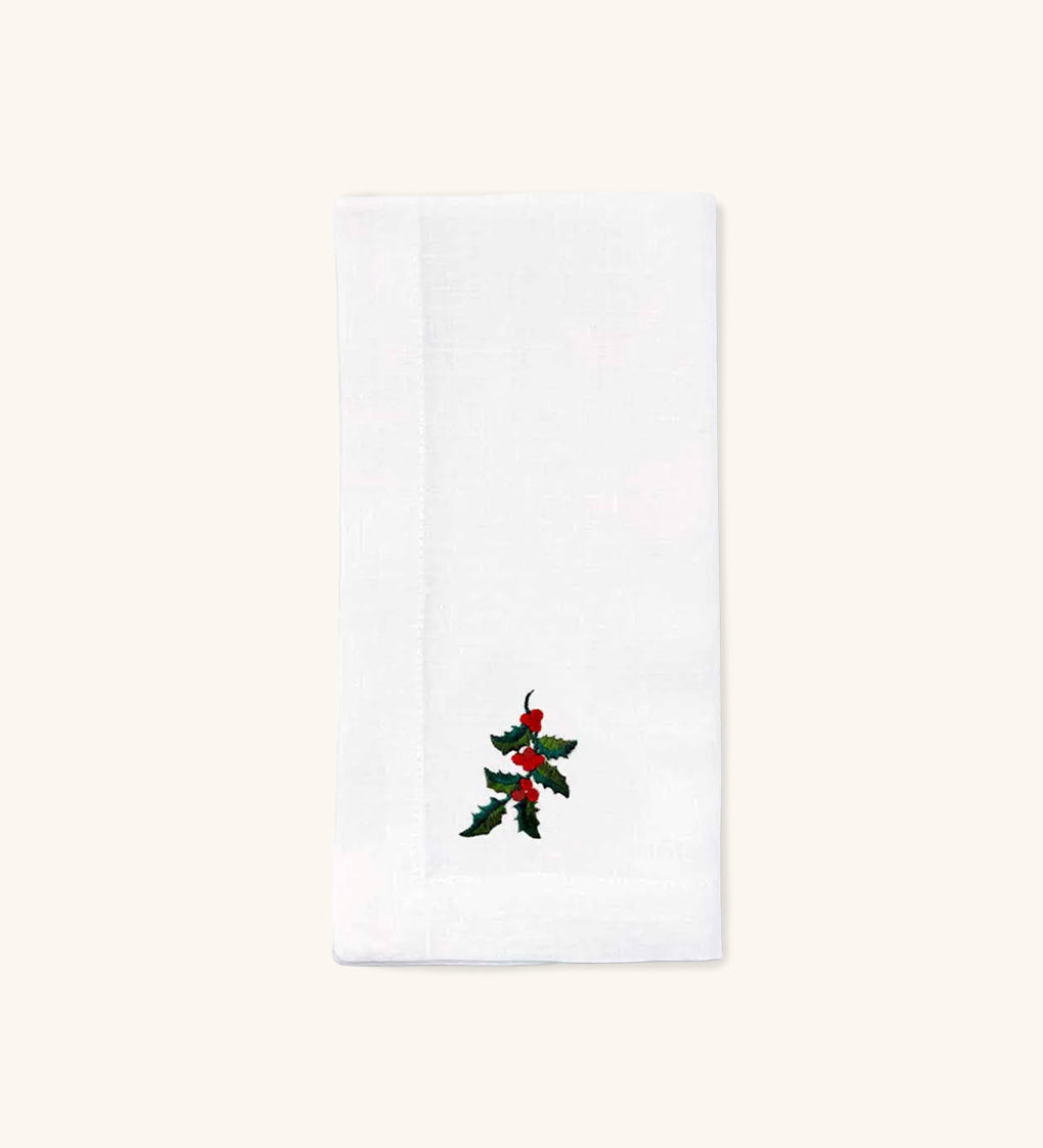 Servilletas en Lino Blanco con Bordado de Muérdago. Set de 4