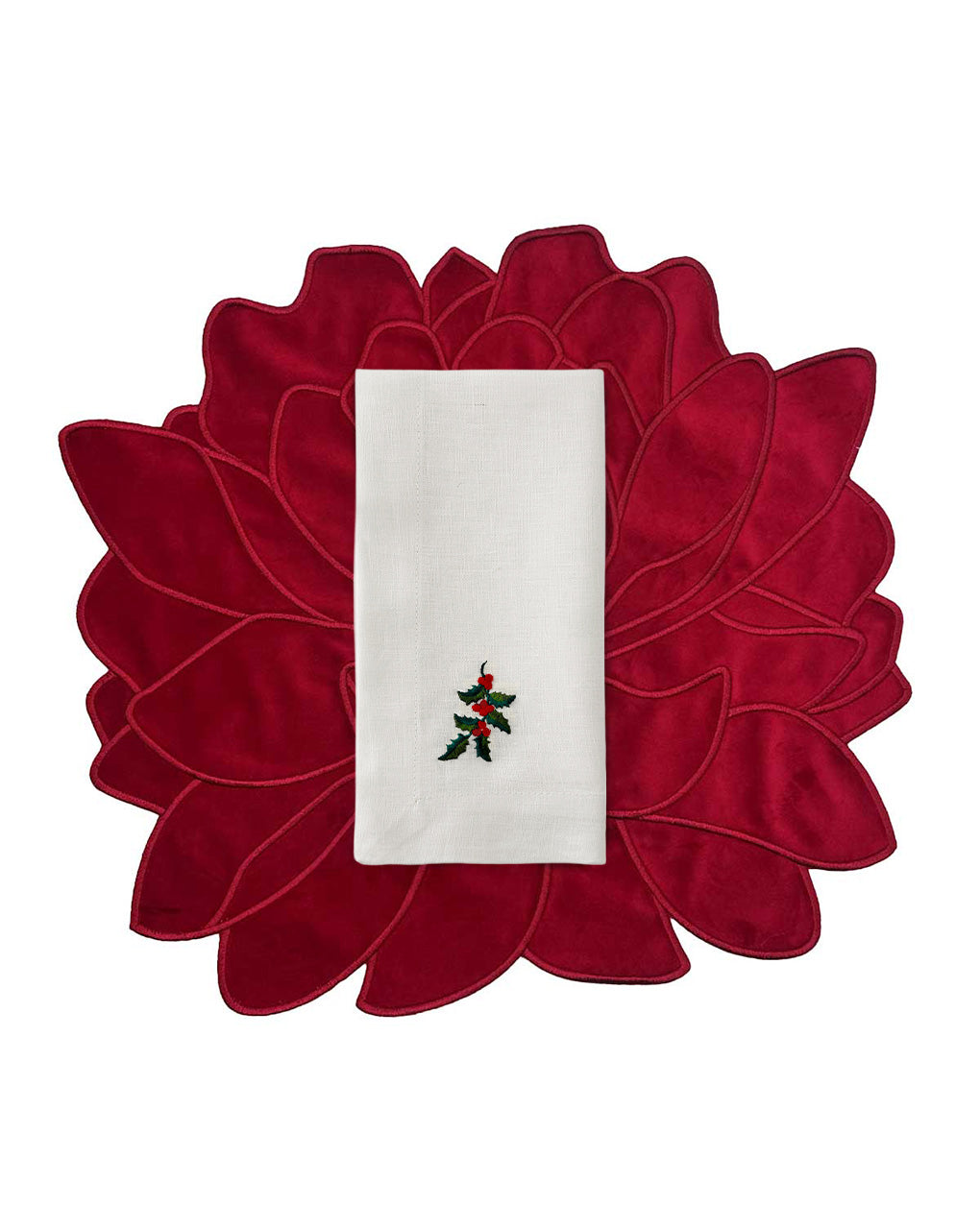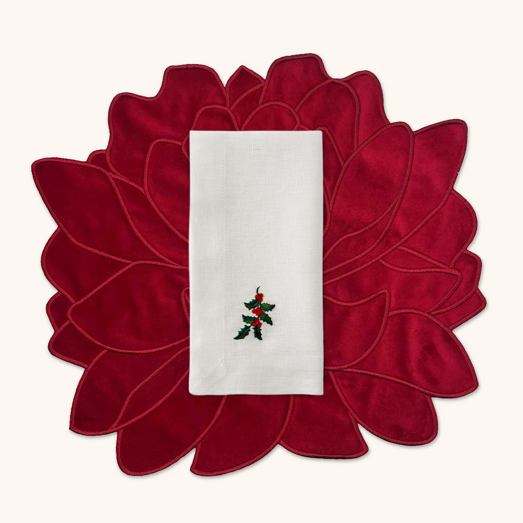 Set de Mantelería Nochebuena con Individuales Blossom Bordado de Flor en Terciopelo Rojo y Servilletas en Lino Blanco con Bordado de Muérdago. Set para 4 personas