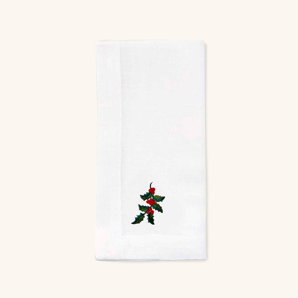 4 Servilletas en Lino Blanco con Bordado de Muérdago