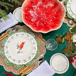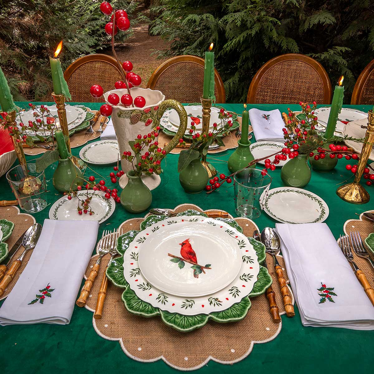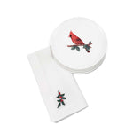 THE CARDINAL ZASHPACK: Set de 4 Servilletas en Lino Blanco con Bordado de Muérdago y 4 Platos de Ensalada con Cardenal Rojo.