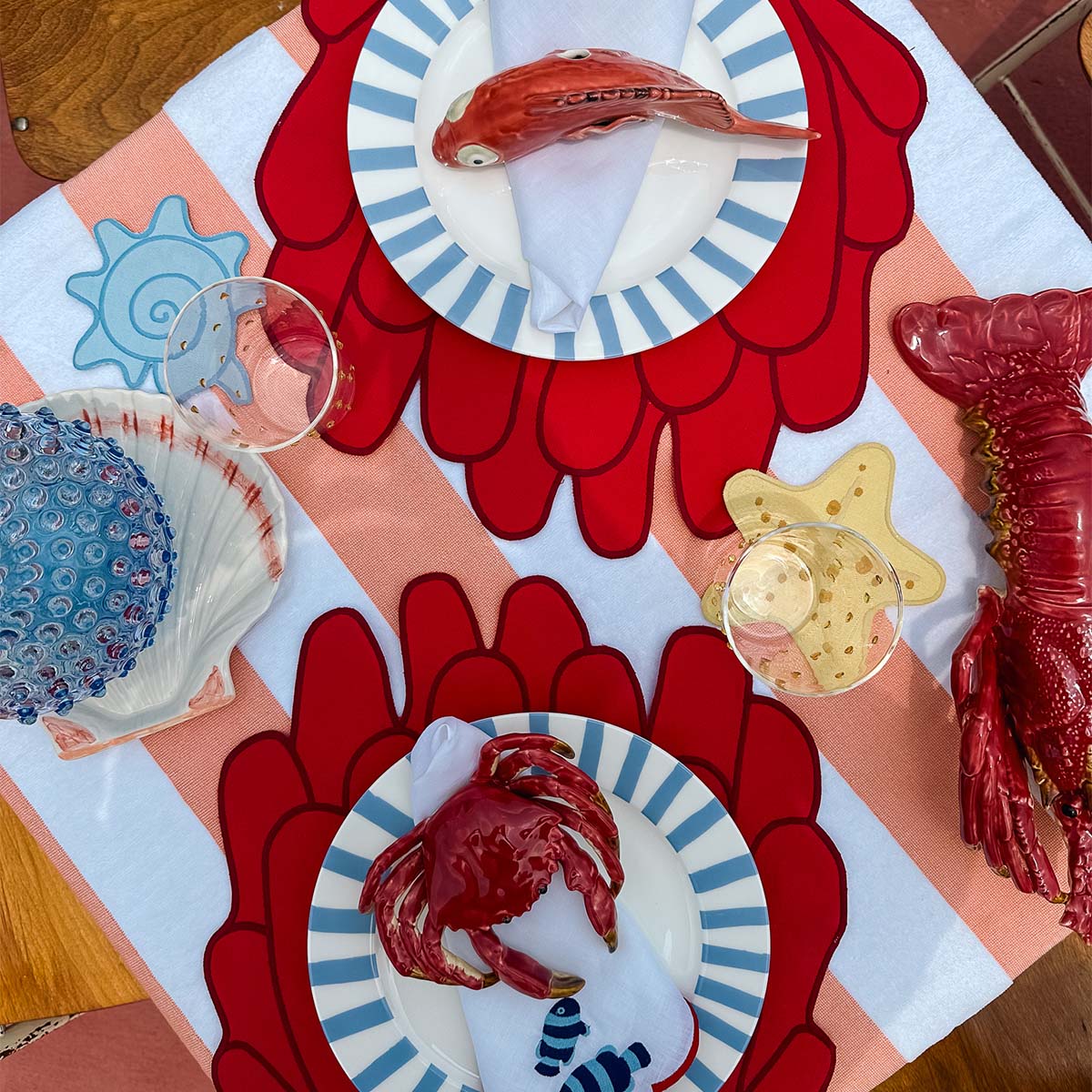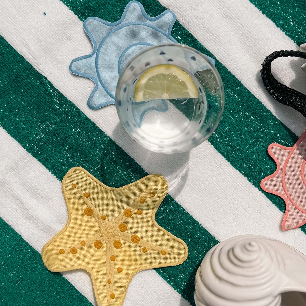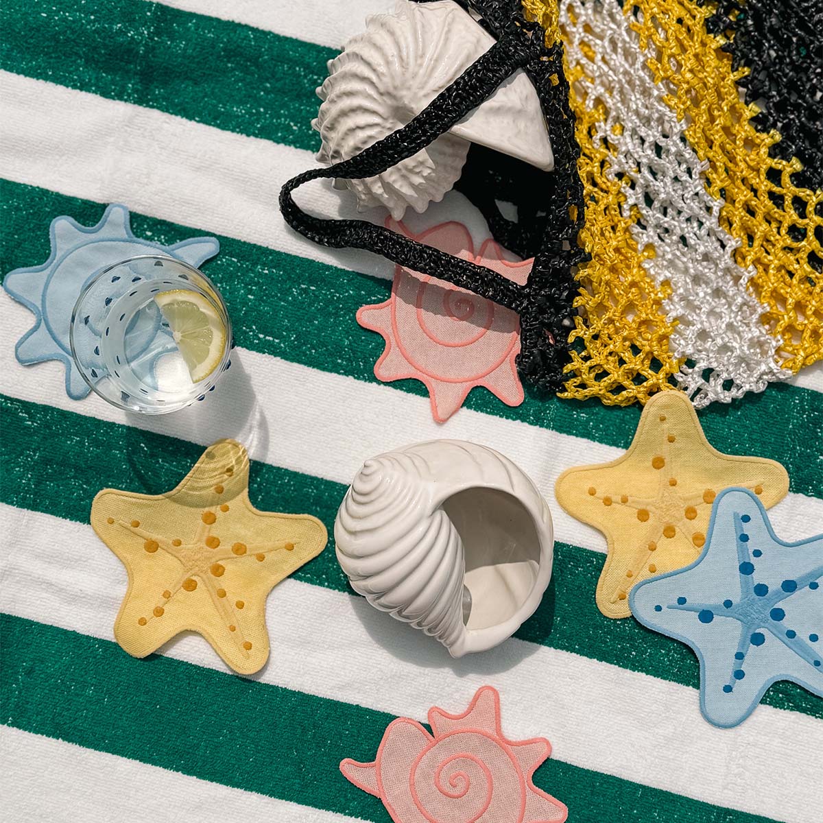 Cocteleras Arrecife con Bordado de Estrella de Mar en Algodón Amarillo. Set de 4