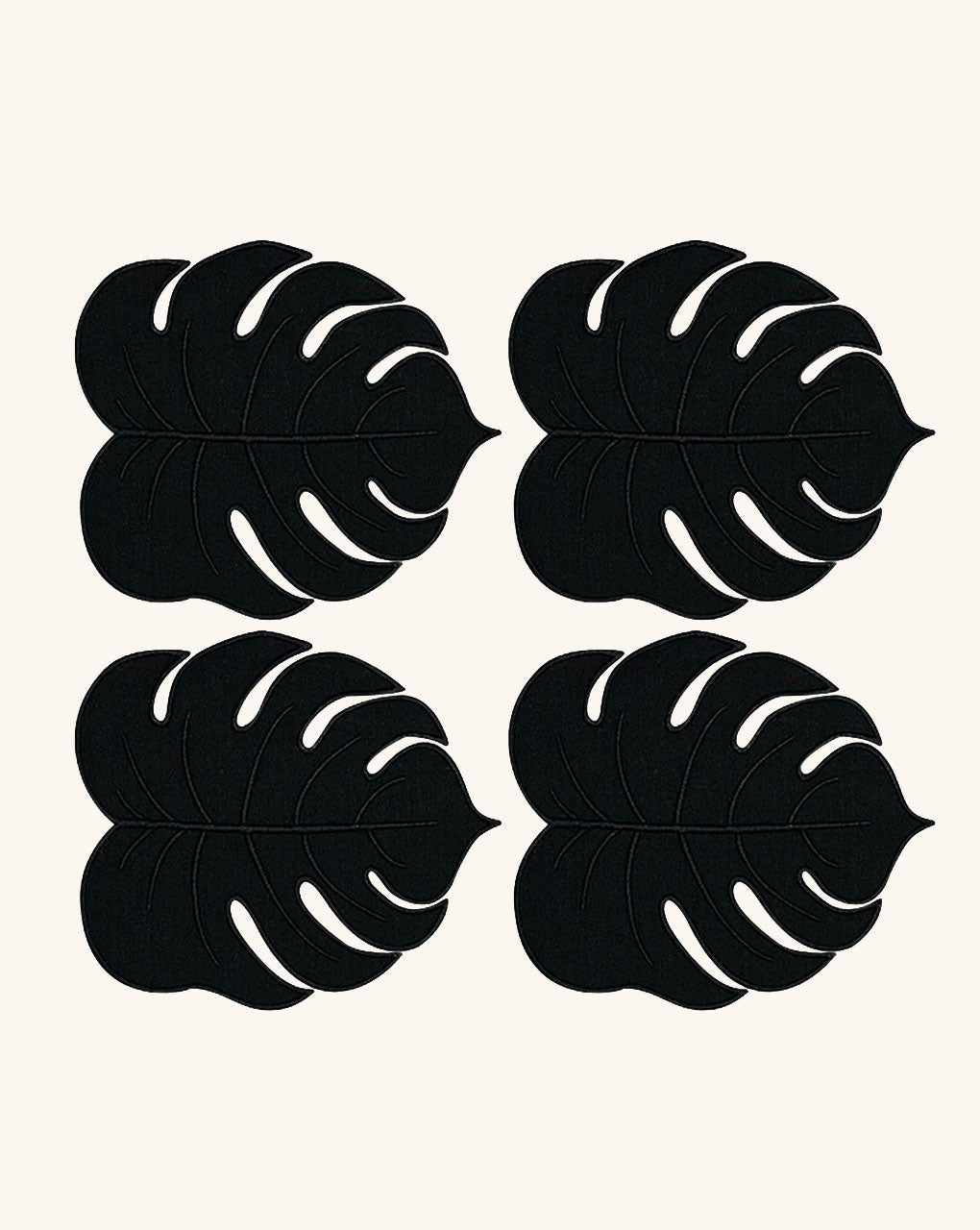 Un diseño icónico de Zash: Coquetas y originales cocteleras en forma de hoja monstera en lino negro, bordadas y recortadas cuidadosamente a mano. Ideales para cualquier lugar y momento: jardín, playa, terraza.