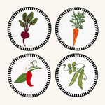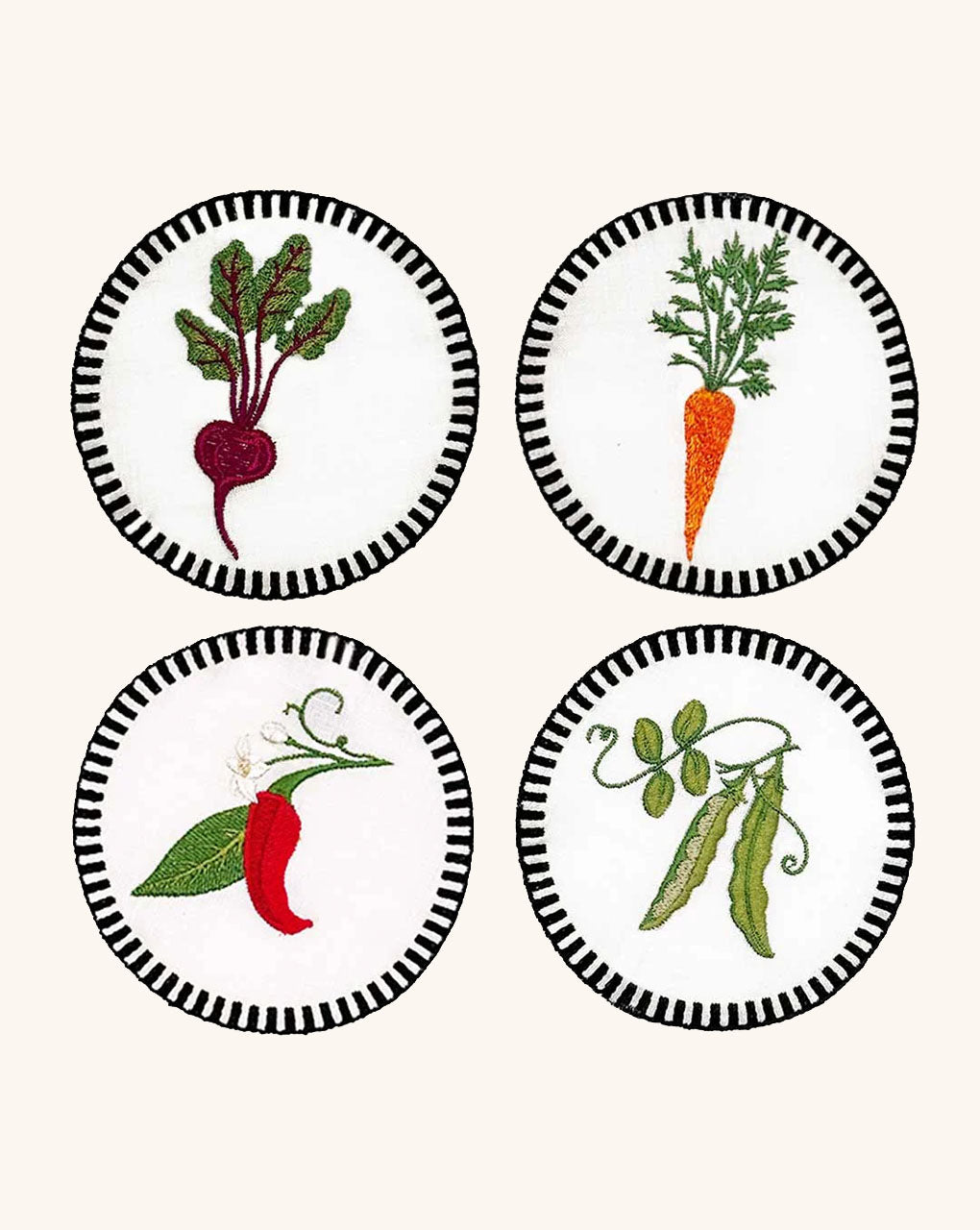 Coasters Veggies en Lino Blanco con Bordado de Verduras. Set de 4