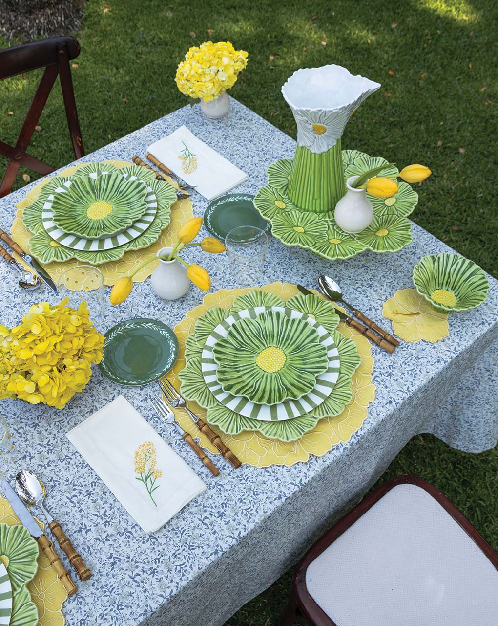 Cocteleras alegres y hermosas bordadas en forma de hortensia azul, recortadas cuidadosamente a mano. Ideal para el jardín o terraza.