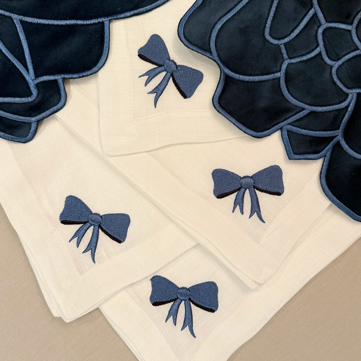 Servilleta en Lino Blanco con Bordado de Moñito Azul. Set de 4