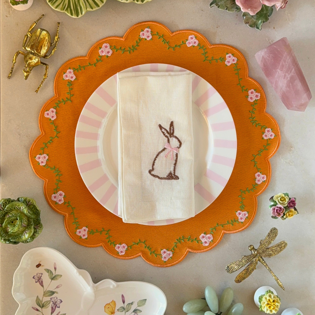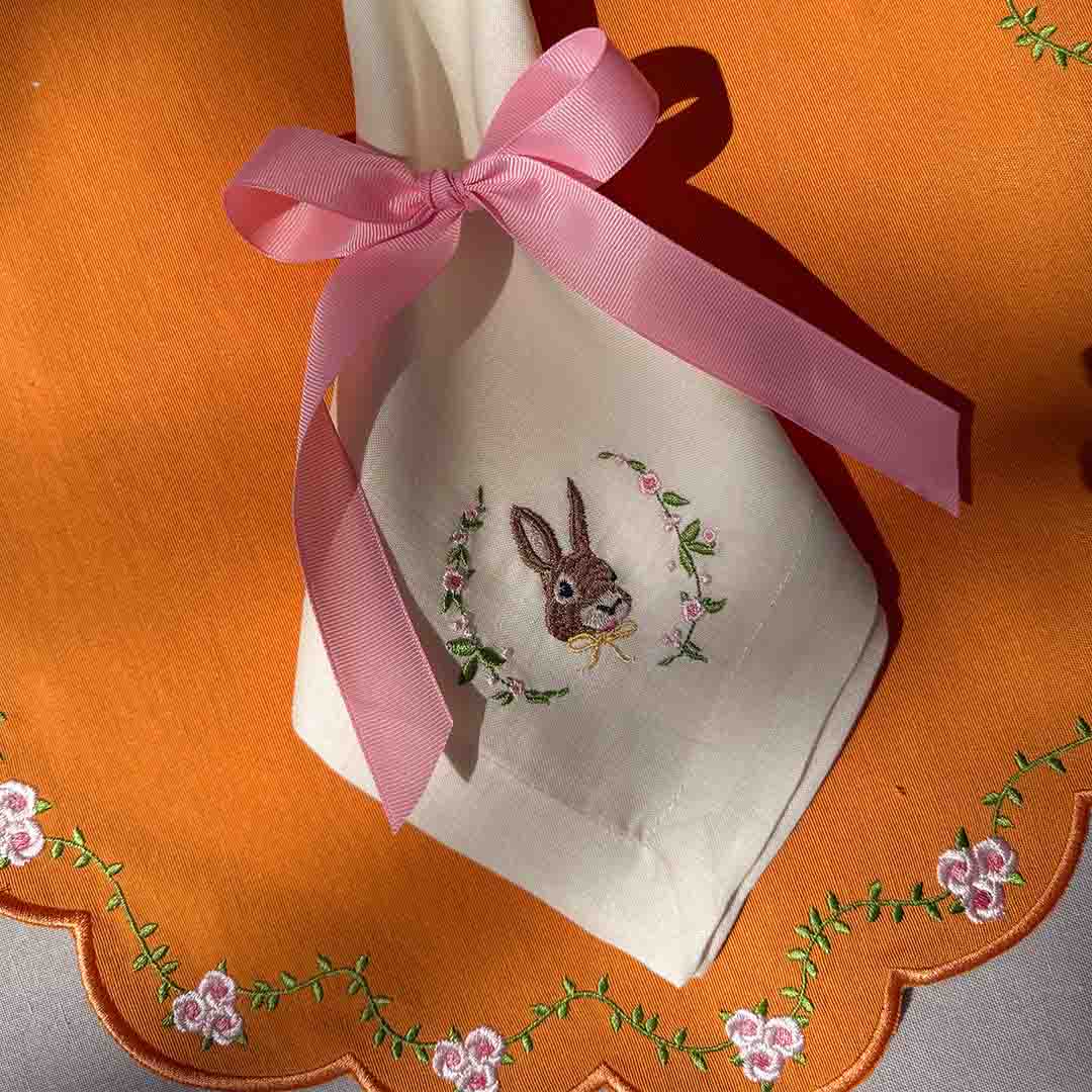 Servilleta Easter en Lino Ivory con Bordado de Conejo con Flores. Set de 4