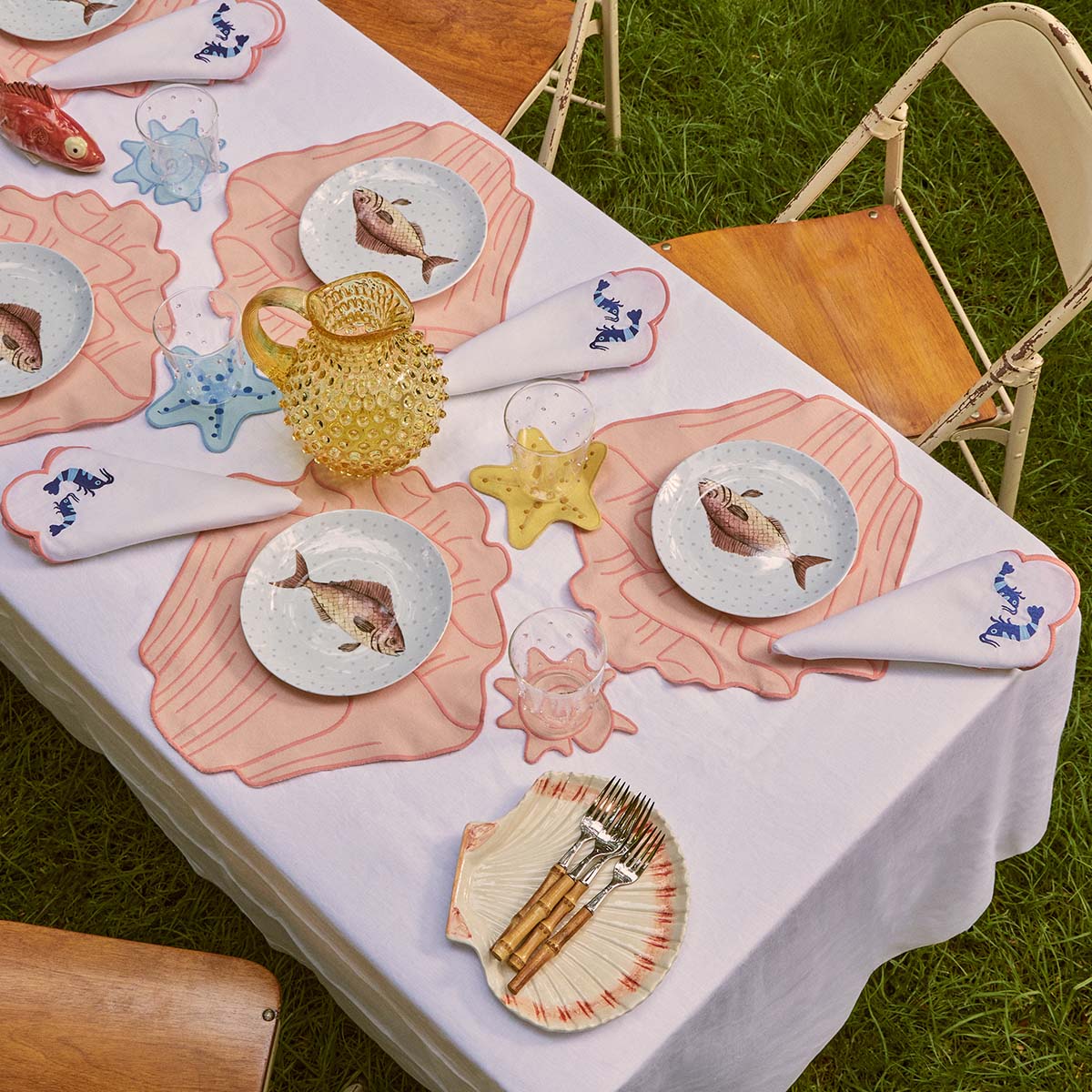 Servilletas Arrecife en Lino Blanco con Bordado de Camarones en tonos de azul y orilla rosa. Set de 4