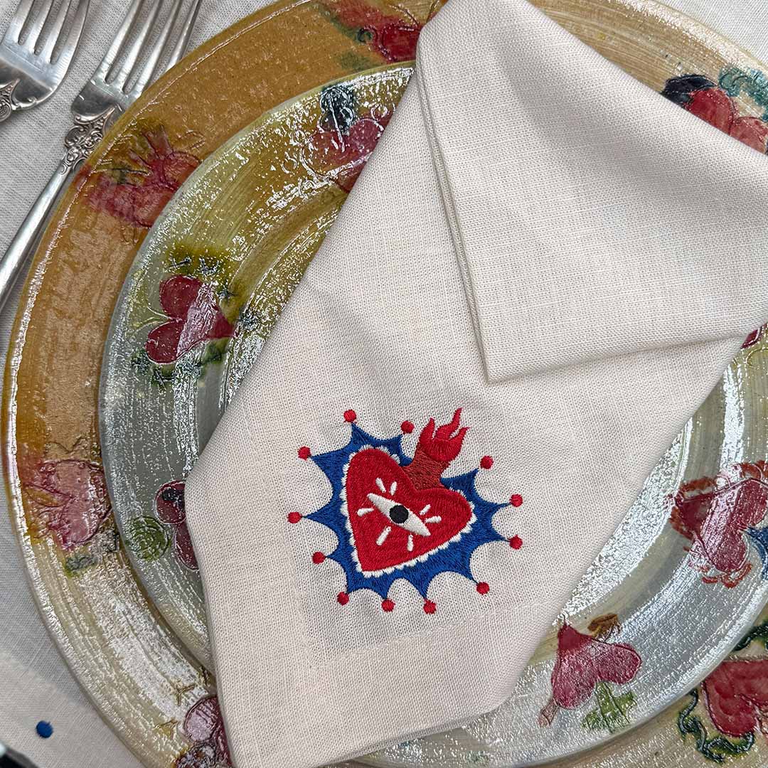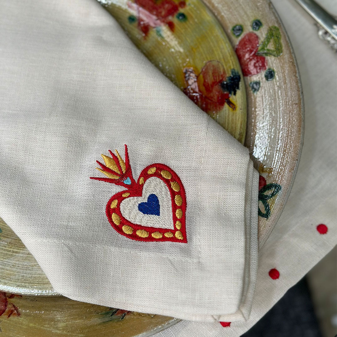 Servilletas Milagritos con Bordado de Corazón en llamas en Lino Arena. Set de 4.