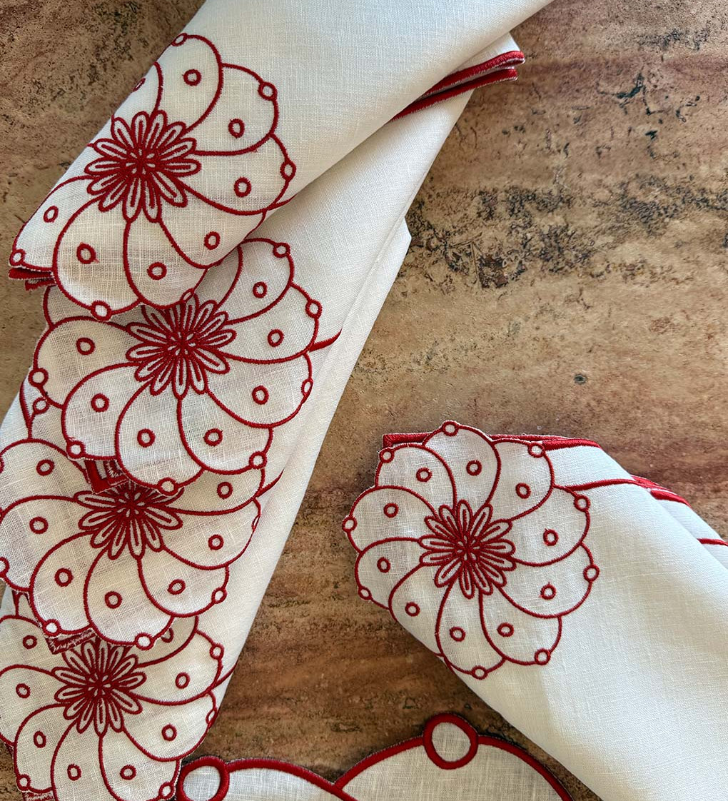 Servilletas Identidad en Lino Blanco con Bordado de Biznaga en Rojo. Set de 4