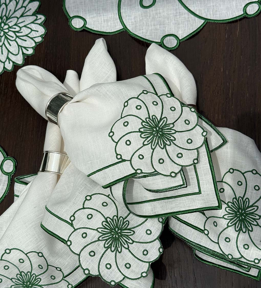 Servilletas Identidad en Lino Blanco con Bordado de Biznaga en Verde. Set de 4