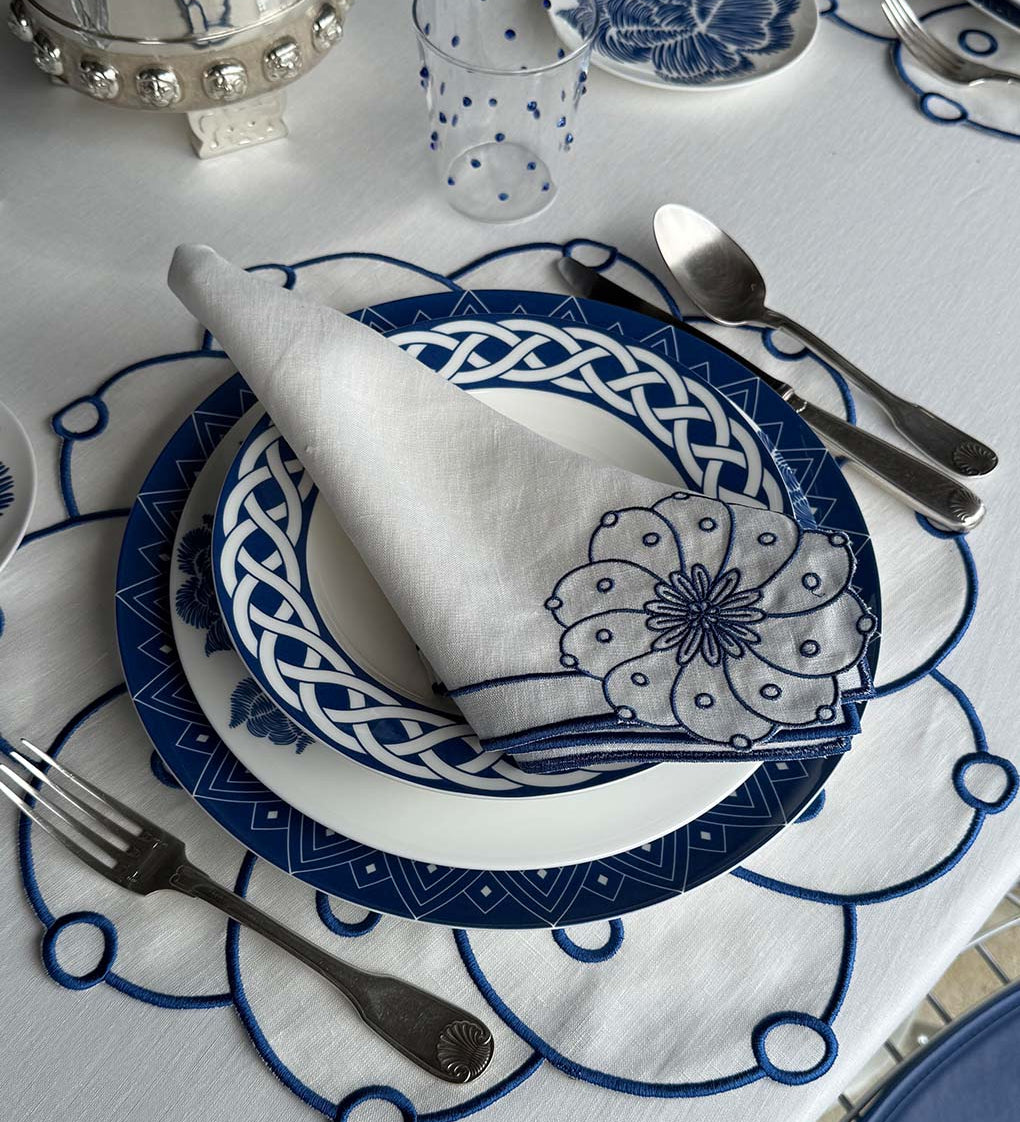 Servilletas Identidad en Lino Blanco con Bordado de Biznaga en Azul. Set de 4