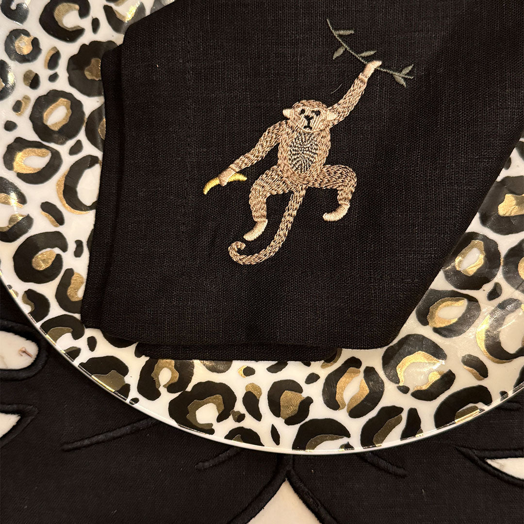 Servilletas Tropic en Lino Negro con Bordado de Chango. Set de 4.