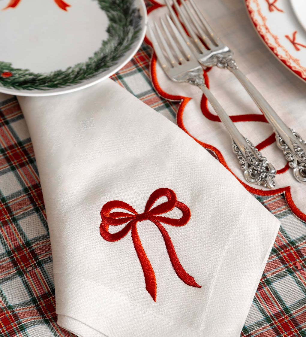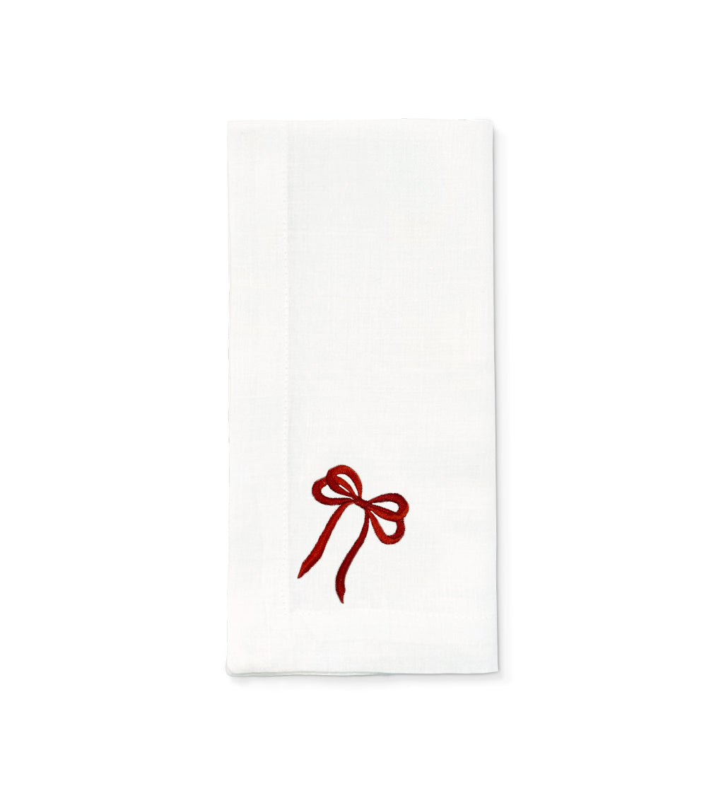 Servilletas Red Bow en Lino Blanco con Bordado de Moño Rojo. Set de 4