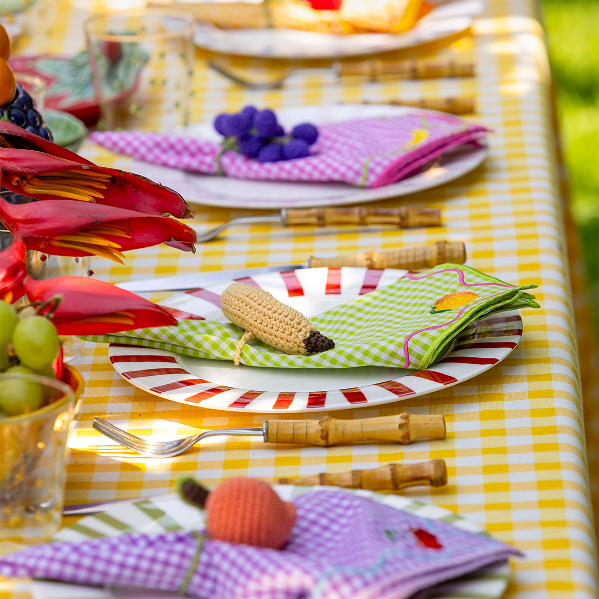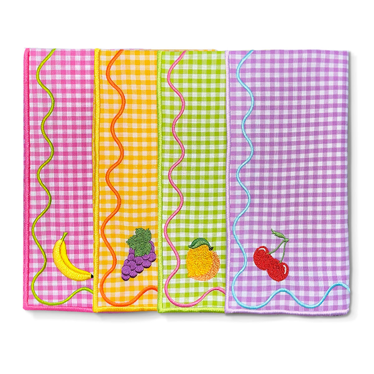 Servilletas Tutti Frutti en Mascota de Algodón de Colores con Bordado de Frutas. Set de 4