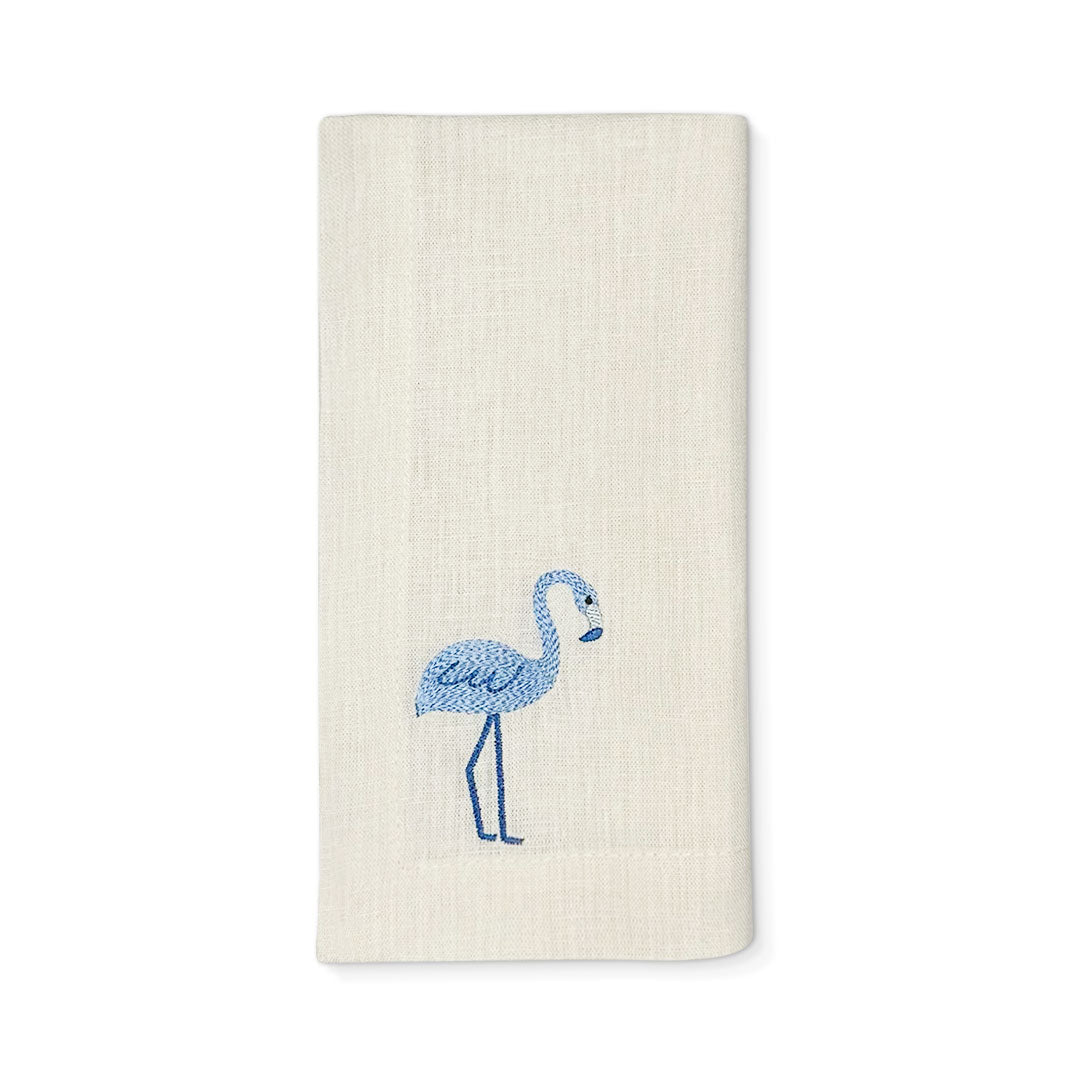 Servilletas Tropic en Lino Arena con Bordado de Flamingo Azul. Set de 4.
