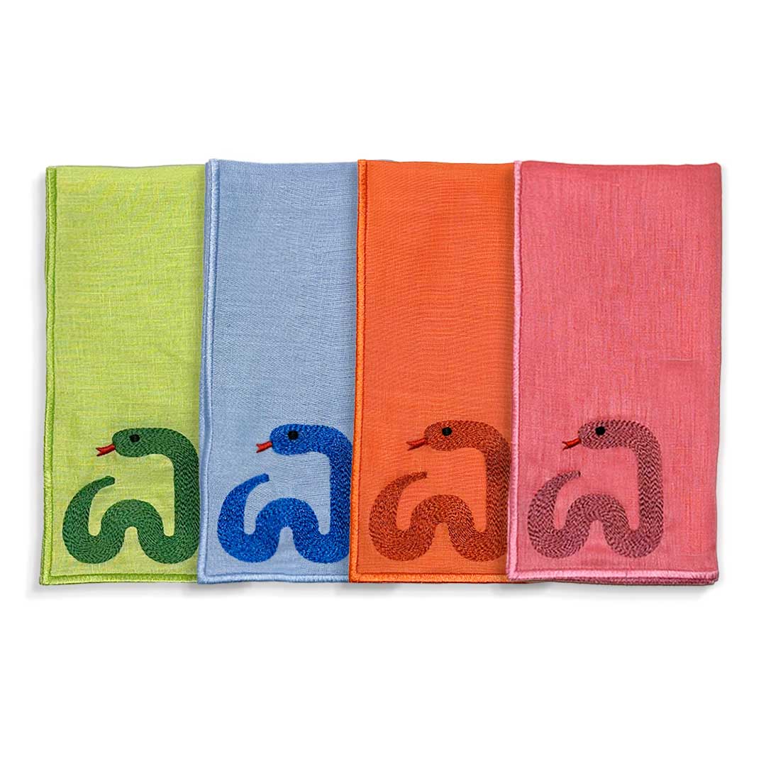 Servilletas Culebra en Lino de Colores Bordado con una Serpiente. Set de 4.