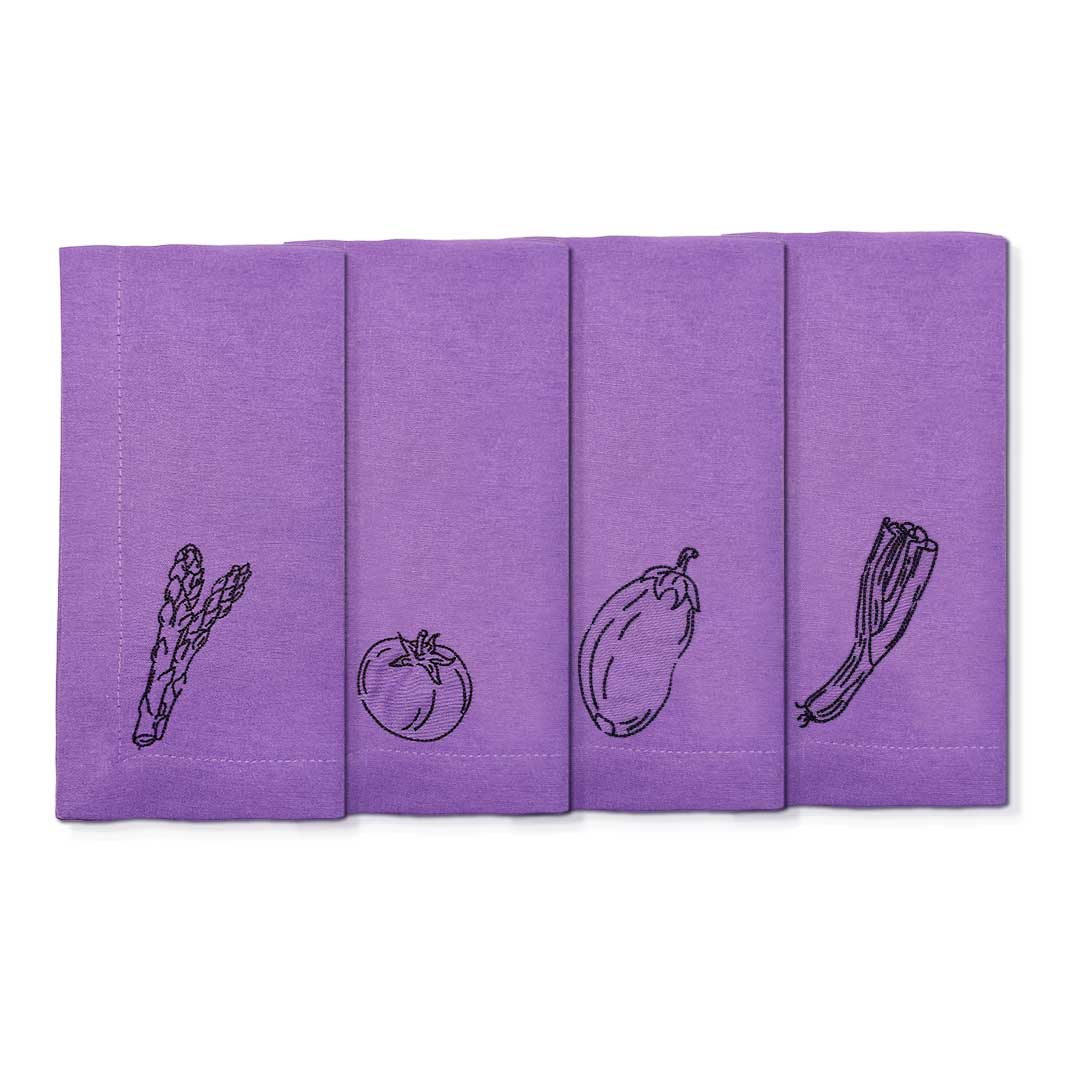 Servilletas Veggies en Algodón Morado Bordado con Verduras. Set de 4