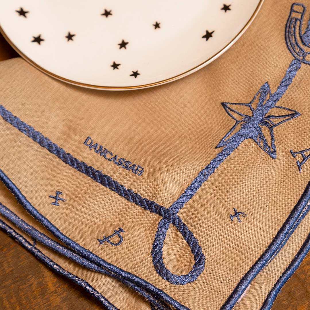 Servilletas Cowgirl en Lino Caramelo con Bordado Azul. Set de 4