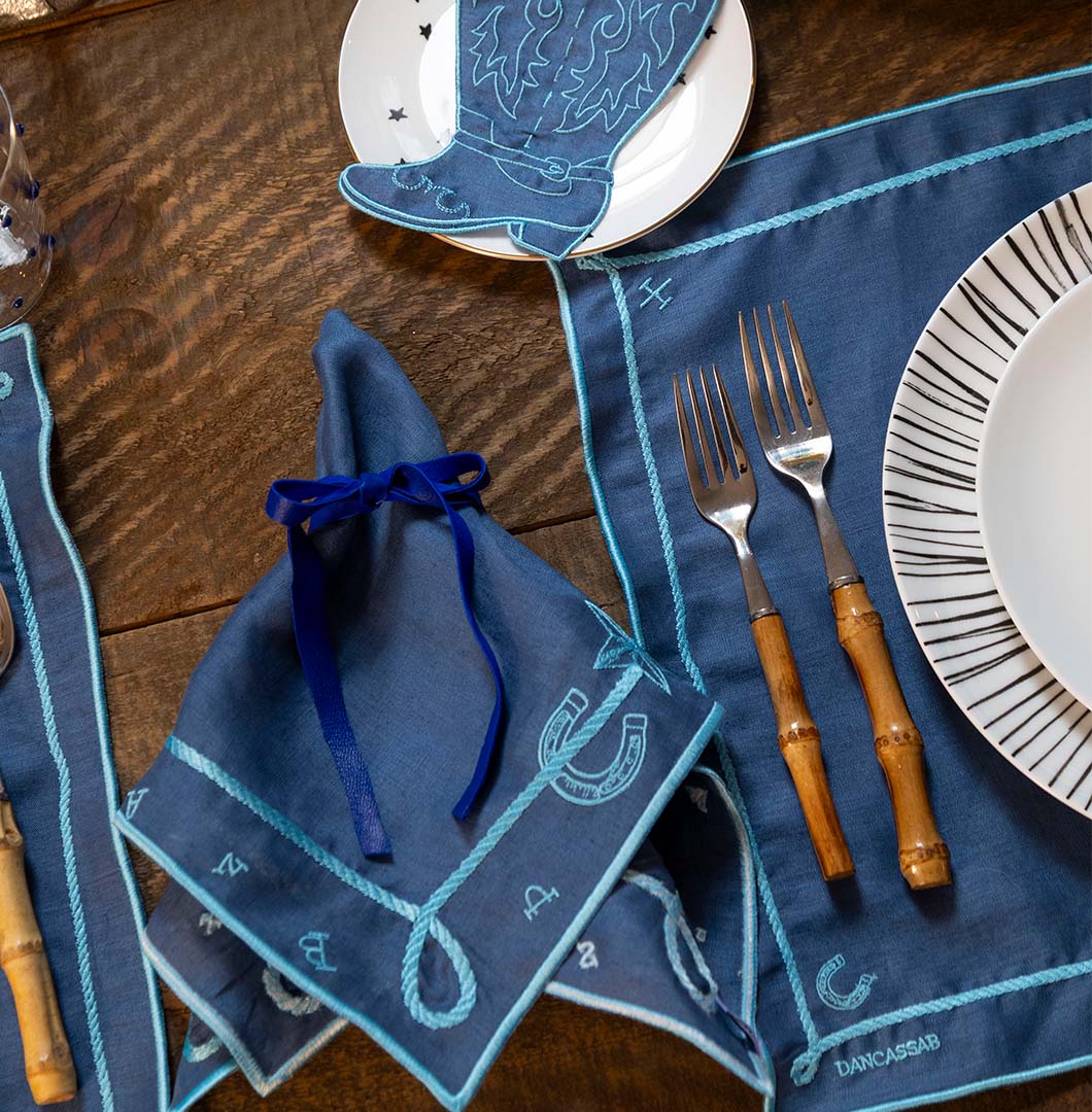 Servilletas Cowgirl en Lino Azul con Bordado Turquesa. Set de 4