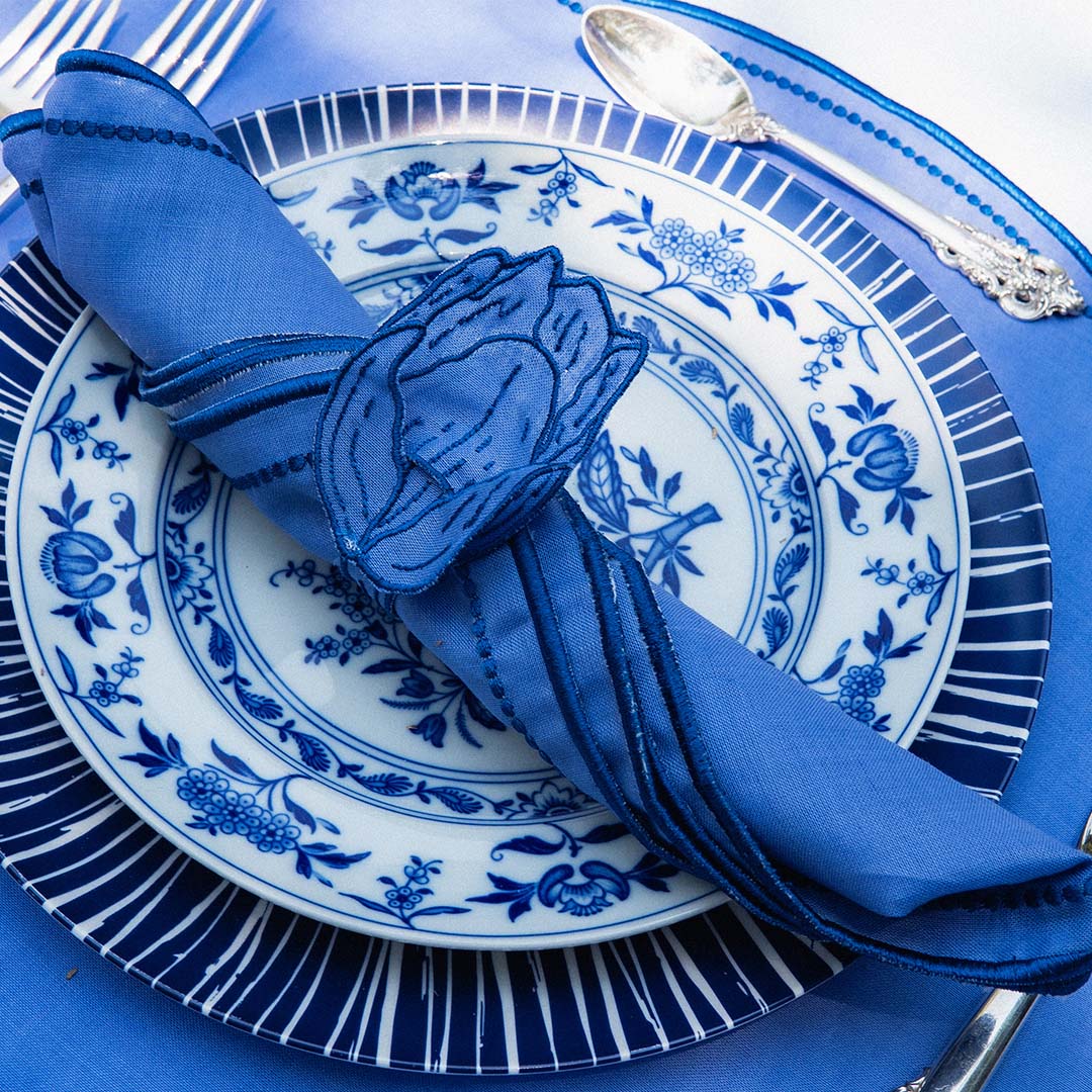 Servilletas Bouquet en Lino Azul con Bordado de Flor. Set de 4