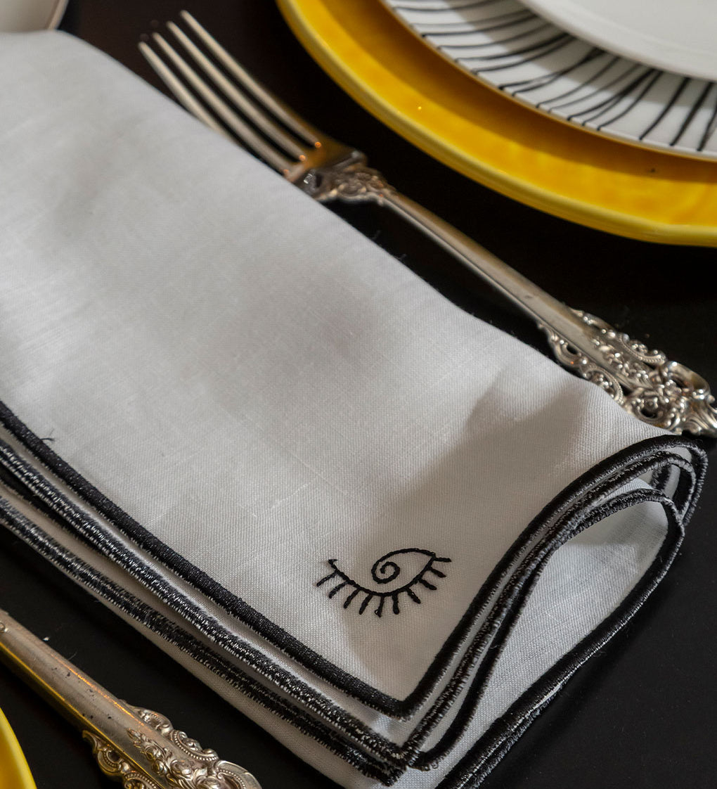 Servilleta de Lino con Orilla en Negro y Ojo Bordado. Set de 4