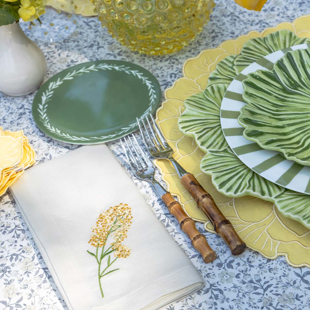 Servilletas Bouquet en Lino Amarillo con Bordado de Flor. Set de 4