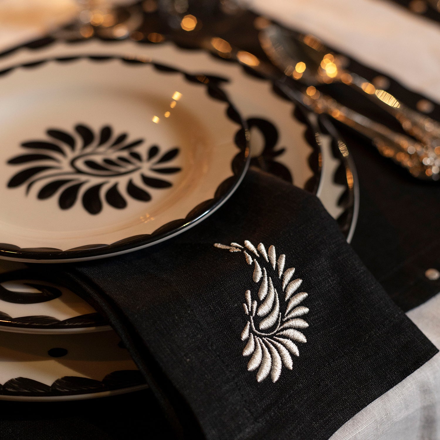Servilleta Silvia en Lino Negro con Bordado de Pluma Ivory. Set de 4
