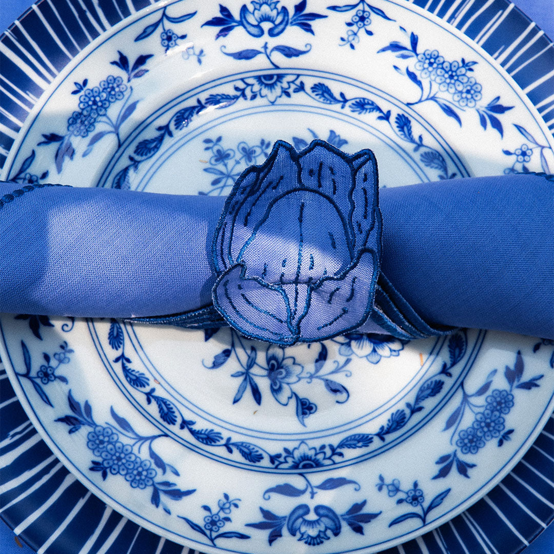 Servilletero de Tulipán en Lino Azul con Bordado Azul. Set de 4