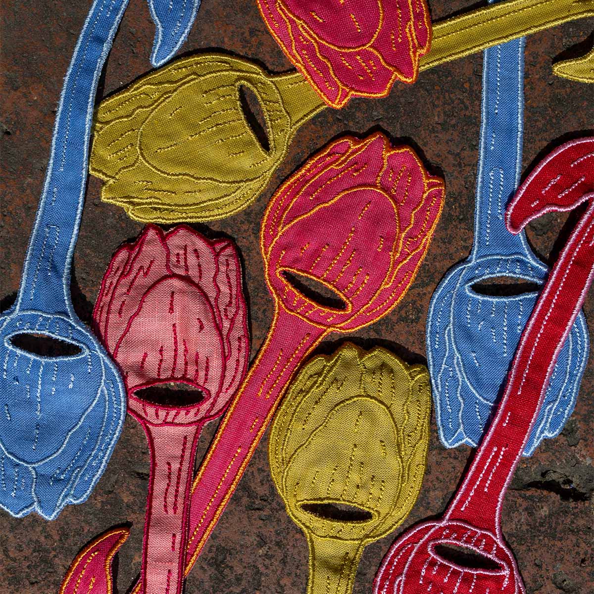 Servilleteros de Tulipán en Lino Rojo con Bordado Rosa. Set de 4
