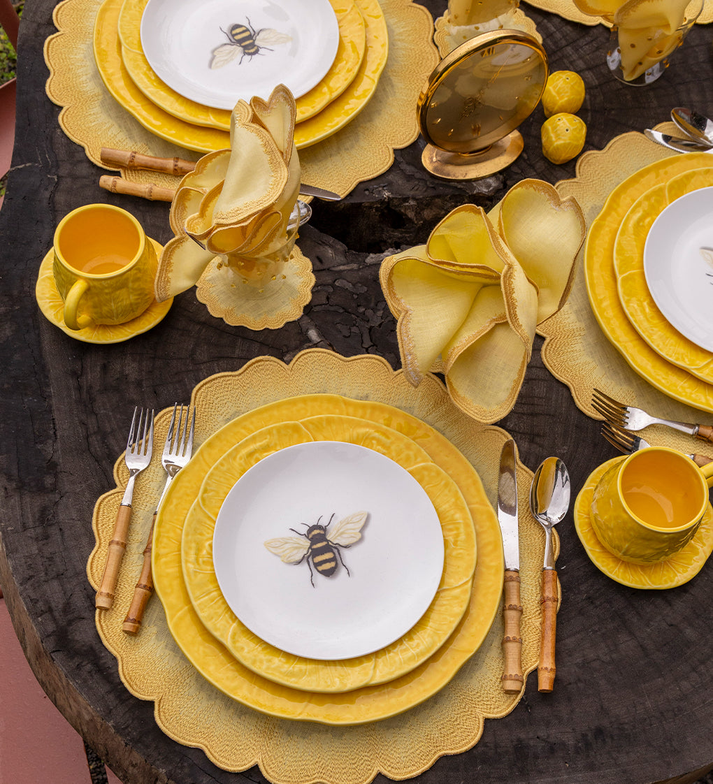 Vajilla con Platos Trinche y Pan de Repollo Amarillo Canario y Platos para Ensalada con Abeja. Set para 4 personas