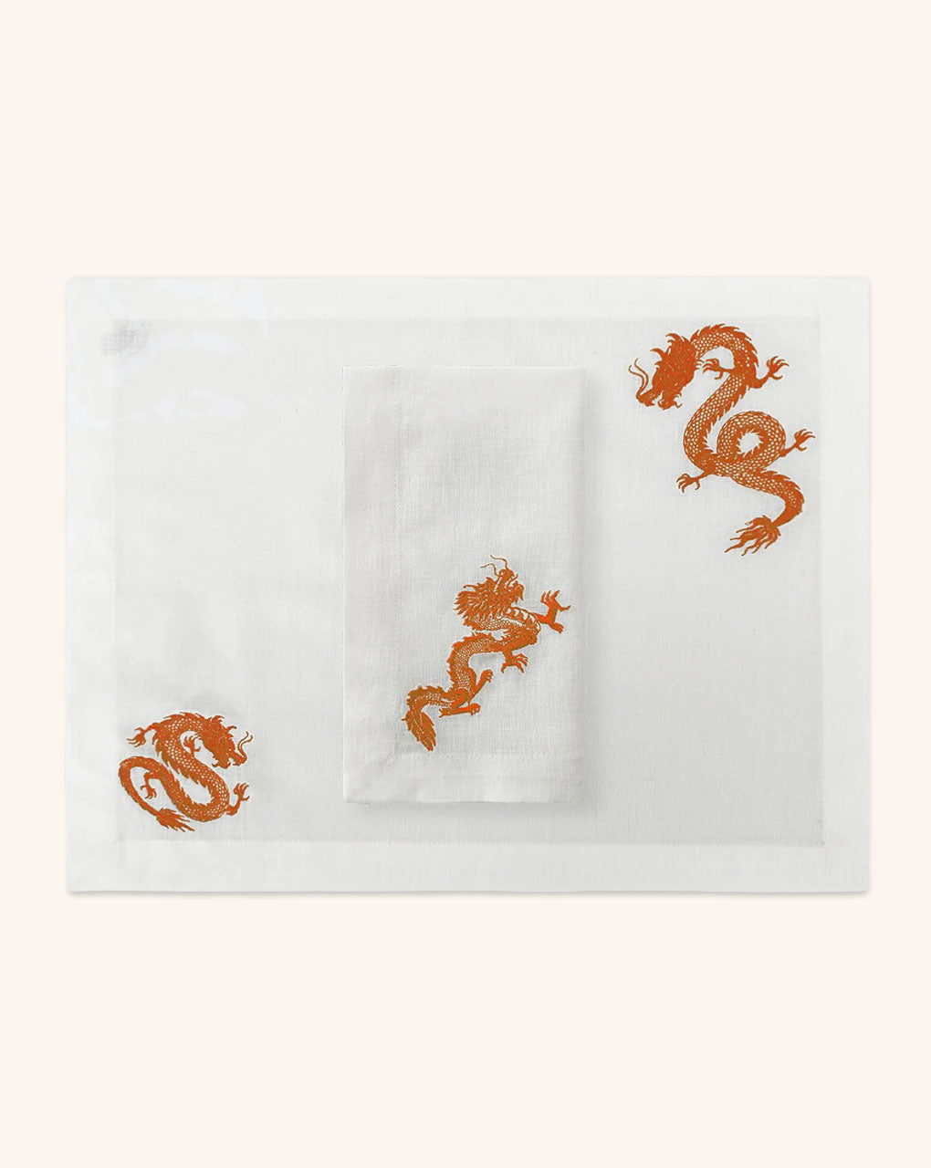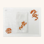Individual con Servilleta de Lino Blanco con Bordado de Dragón Naranja. Set de 4