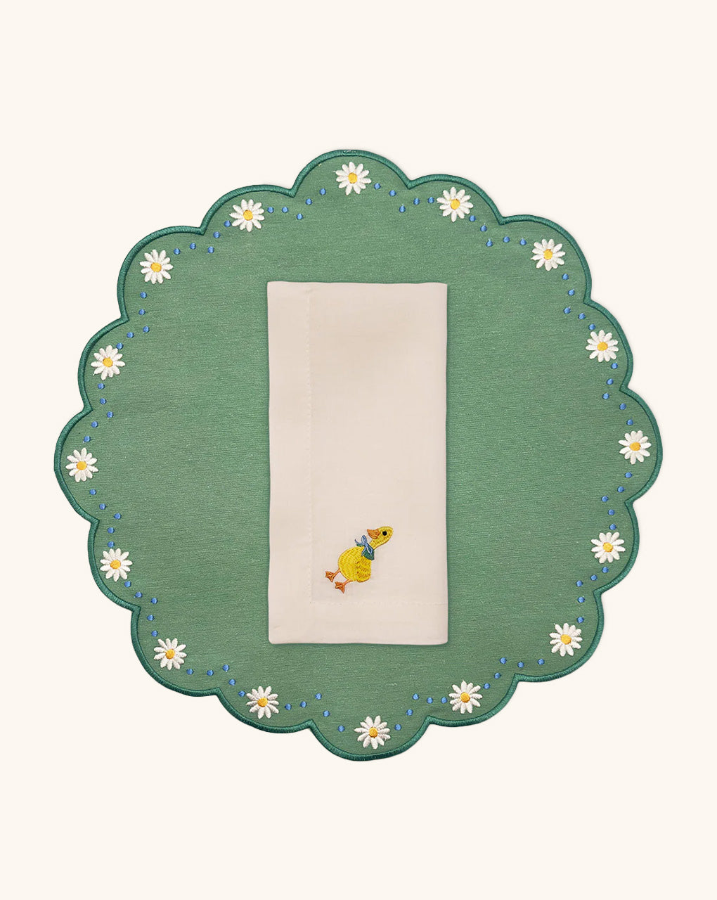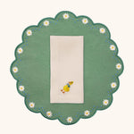 Mantelería Easter con Individual Pily en Algodón Verde con Bordado de Margaritas y Servilleta Easter en Lino Ivory con Bordado de Pato. Set de 4