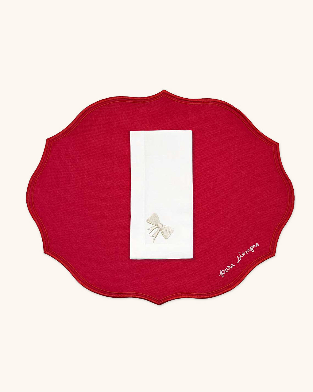 Set de Mantelería con Individuales Mystic de Algodón Rojo con Bordado "Para siempre" y Servilletas Bow en Lino Blanco Bordado con Moño Ivory. Para 4 personas