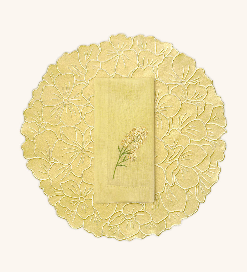 Mantelería Bouquet Amarillo con Individuales en Algodón Bordado de Hortensia y Servilletas en Lino con Bordado de Flor. Set de 4