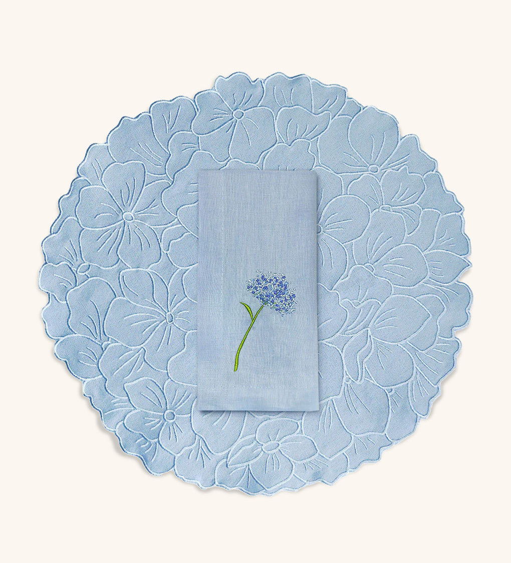 Mantelería Bouquet Azul con Individuales en Algodón Bordado de Hortensia y Servilletas en Lino con Bordado de Flor. Set de 4