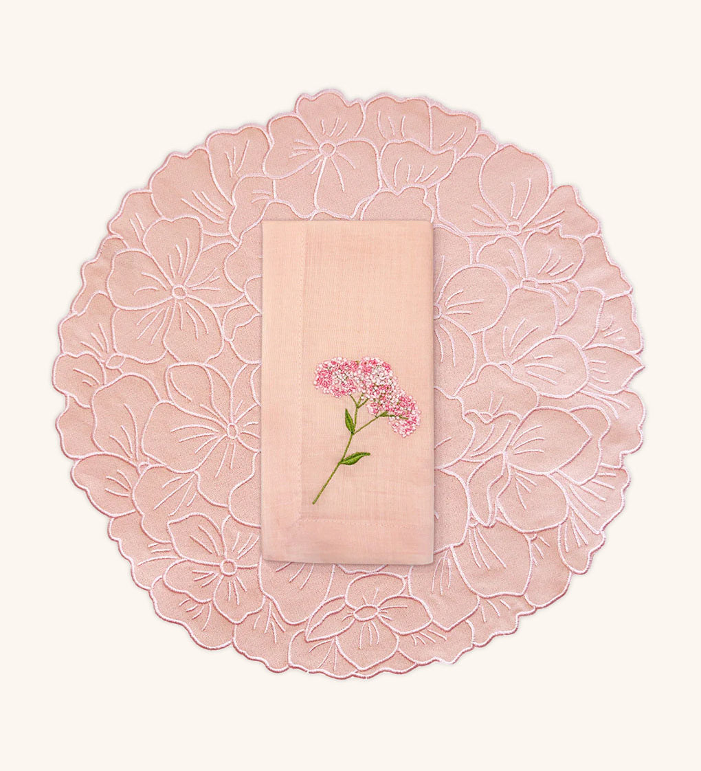 Mantelería Bouquet Rosa con Individuales en Algodón Bordado de Hortensia y Servilletas en Lino con Bordado de Flor. Set de 4