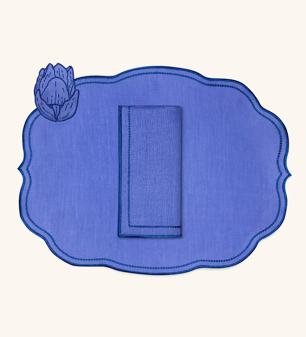 Mantelería Sofía completa con Individual, Servilleta y Servilletero Tulipán en Lino Azul y Bordado en Azul. Set para 4 personas