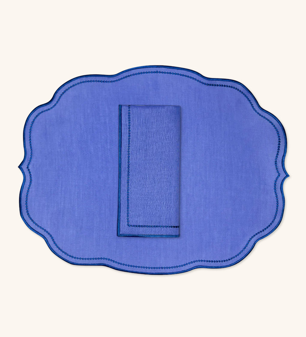 Mantelería Sofía con Individual y Servilleta en Lino Azul y Bordado en Azul. Set para 4 personas