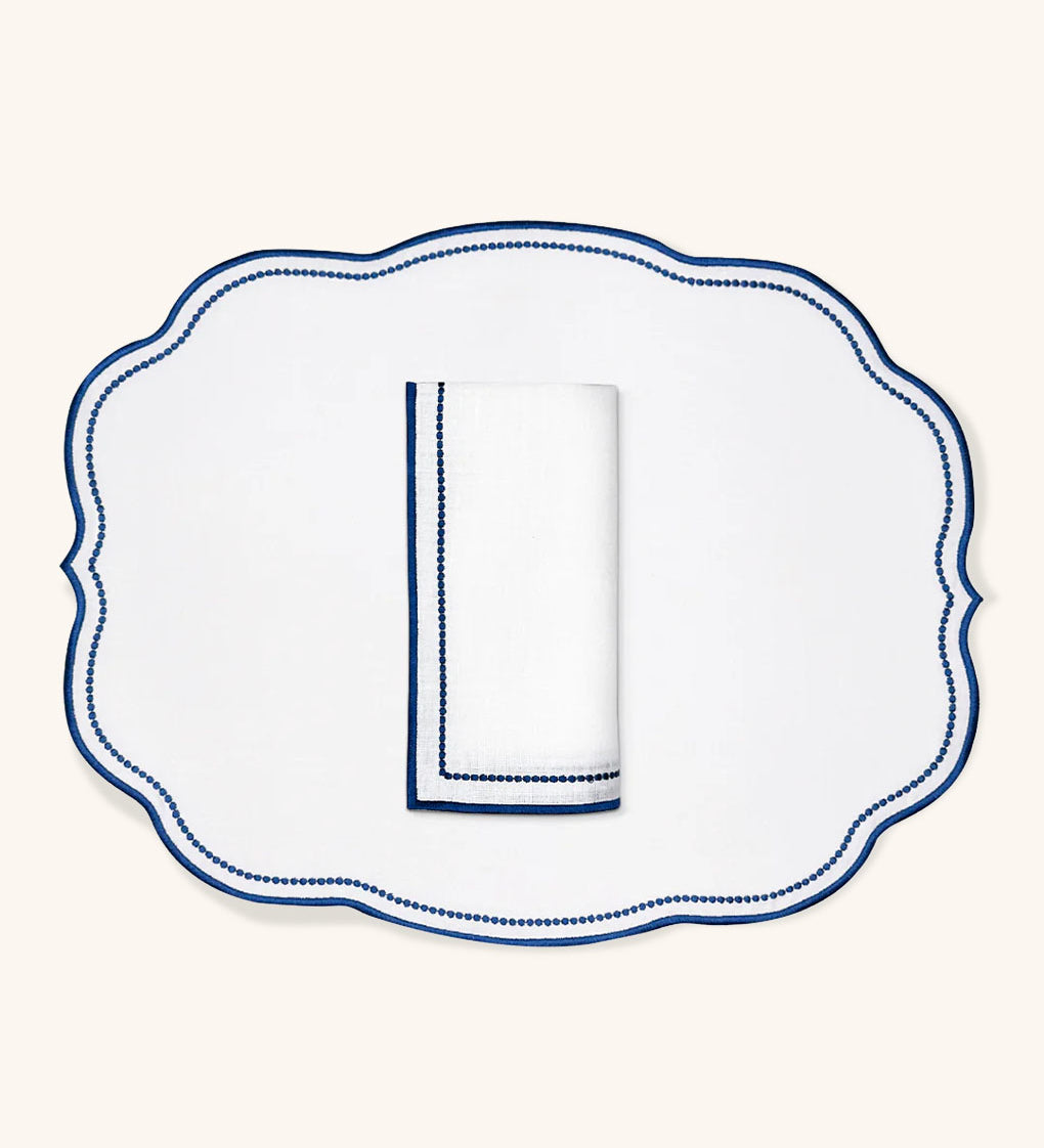 Mantelería Sofía con Individual y Servilleta en Lino Blanco y Bordado en Azul. Set para 4 personas