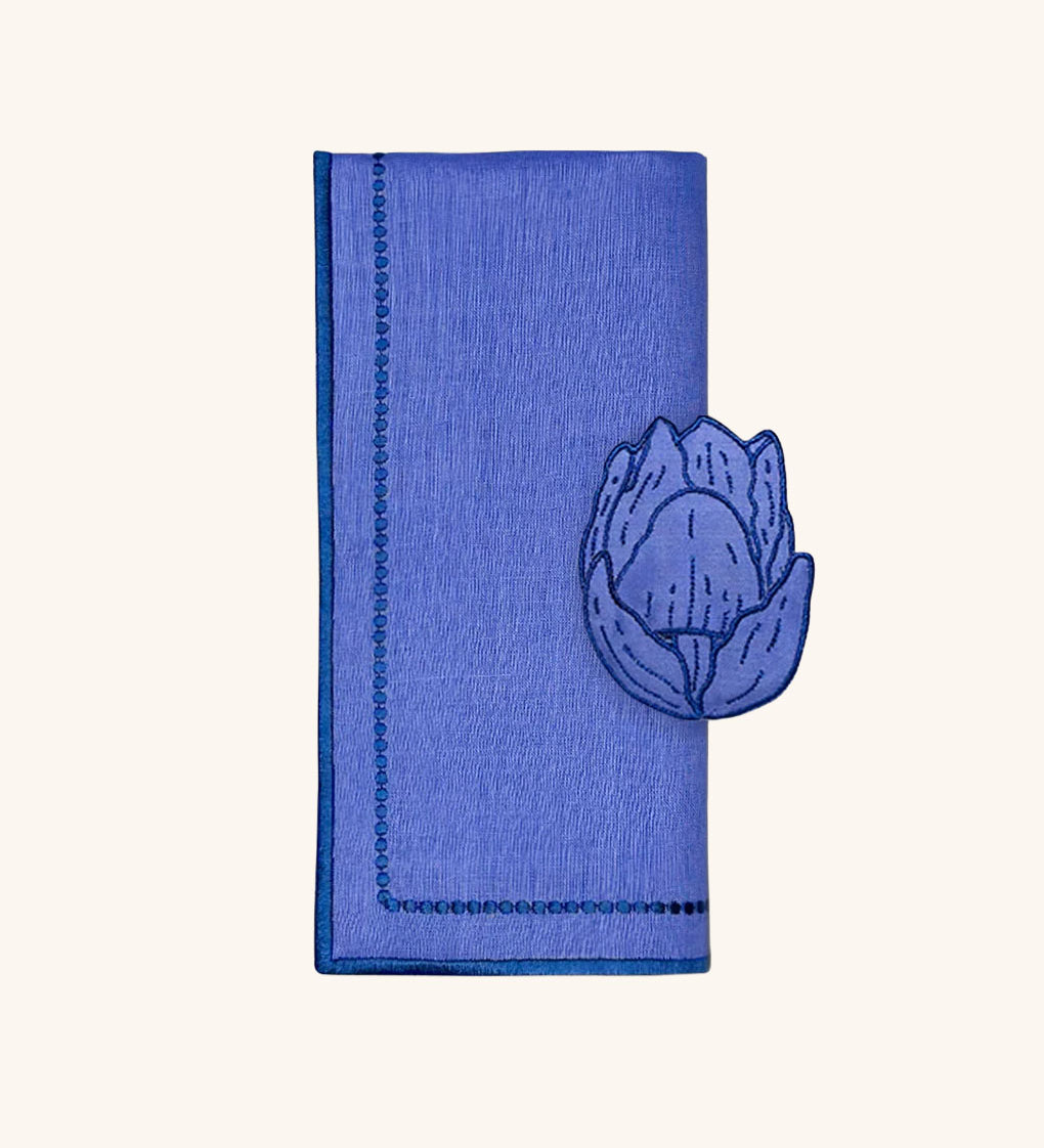 Mantelería Sofía con Servilleta y Servilletero Tulipán en Lino Azul y Bordado en Azul. Set para 4 personas