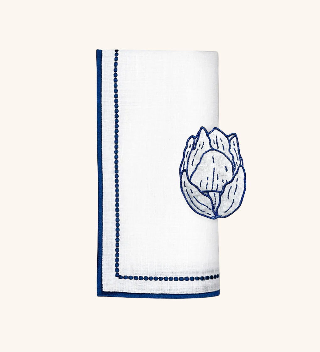 Mantelería Sofía con Servilleta y Servilletero Tulipán en Lino Blanco y Bordado en Azul. Set para 4 personas