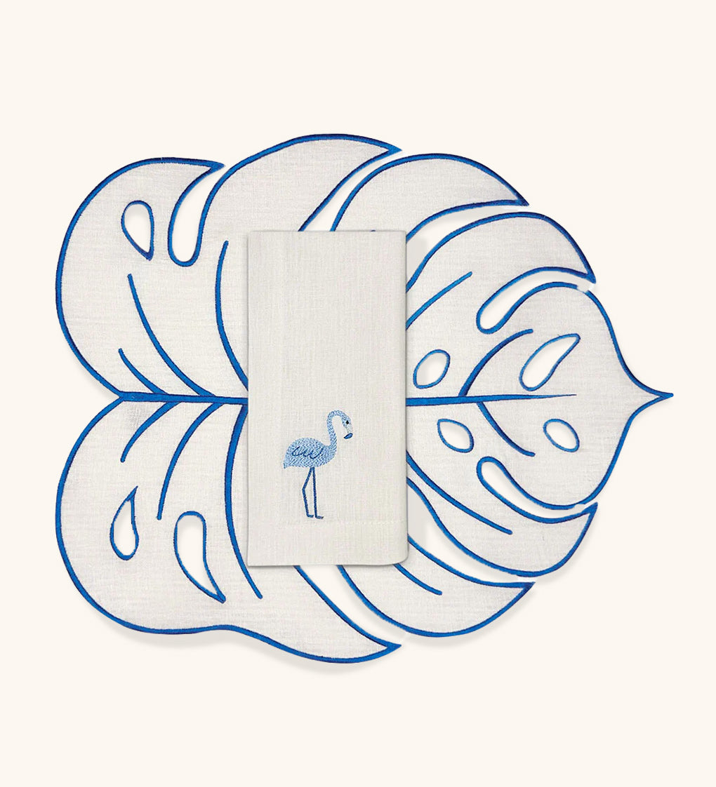 Mantelería Tropic en Lino Arena Bordado con Azul con Individuales de Hoja y Servilleta Bordado de Flamingo. Set para 4 personas