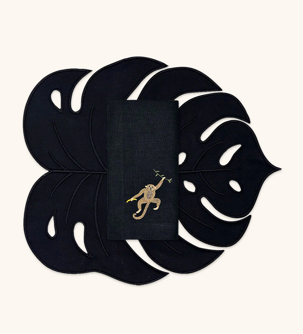 Set Completo de Mantelería Tropic en Lino Negro con Individual y Cocteleras de Hoja Monstera y Servilleta con Bordado de Chango. Set para 4 personas