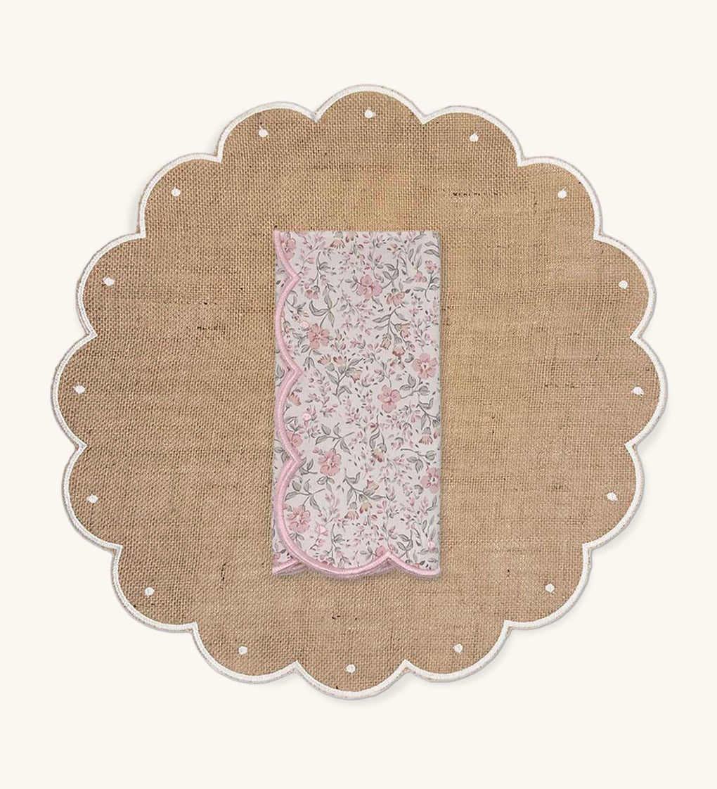 Mantelería con Individuales Daisy en Yute con Bordado Ivory y Servilletas Daisy con Florecitas Rosa. Set de 4