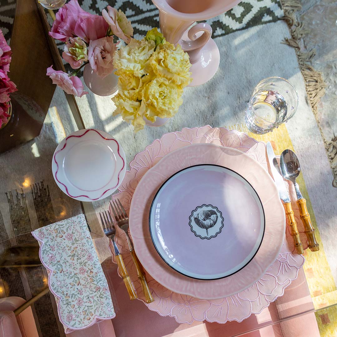 Plato Ensalada con Lisianthus Rosas y Listón Rosa. Set de 4