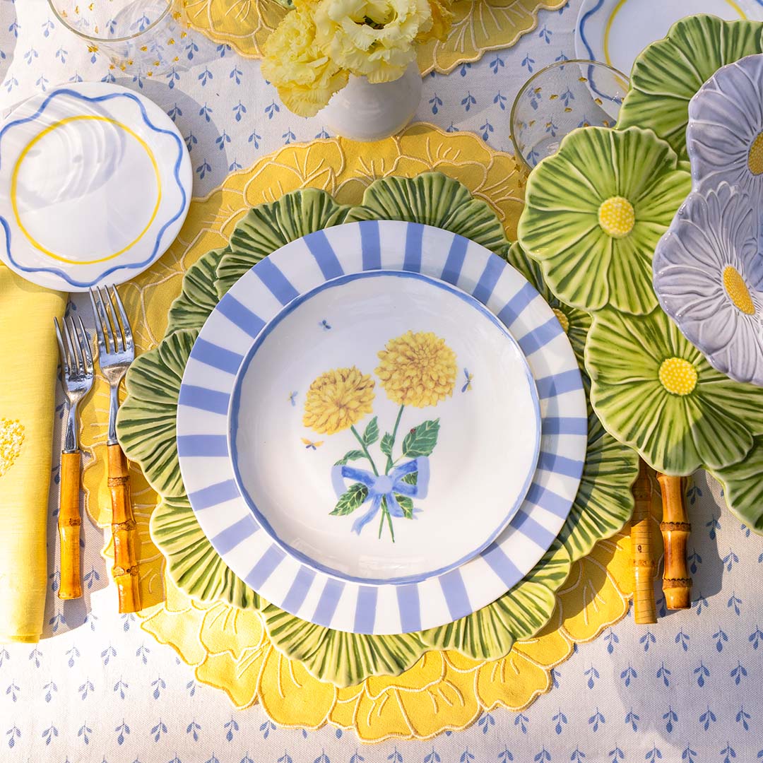 Platos Ensalada con Dalias amarillas y Listón Azul. Set de 4