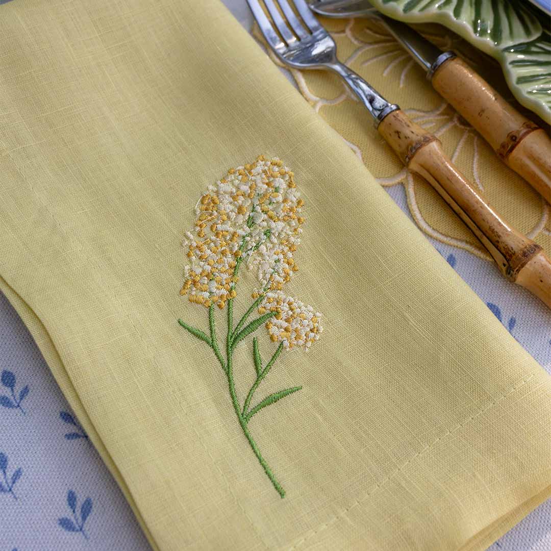 Servilletas Bouquet en Lino Amarillo con Bordado de Flor. Set de 4