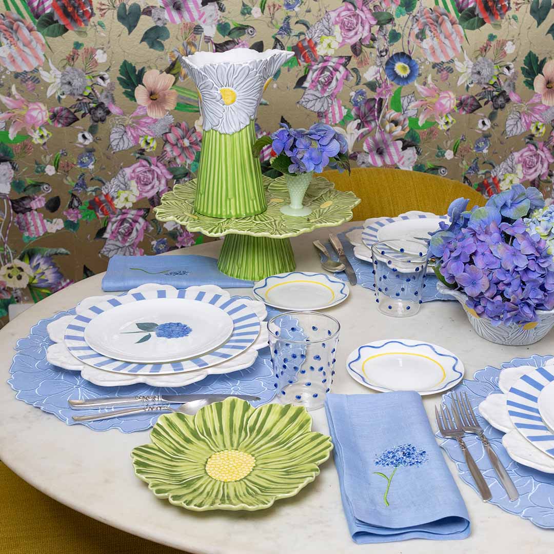 Individuales Bouquet en Algodón Azul con Bordado de Hortensia. Set de 4